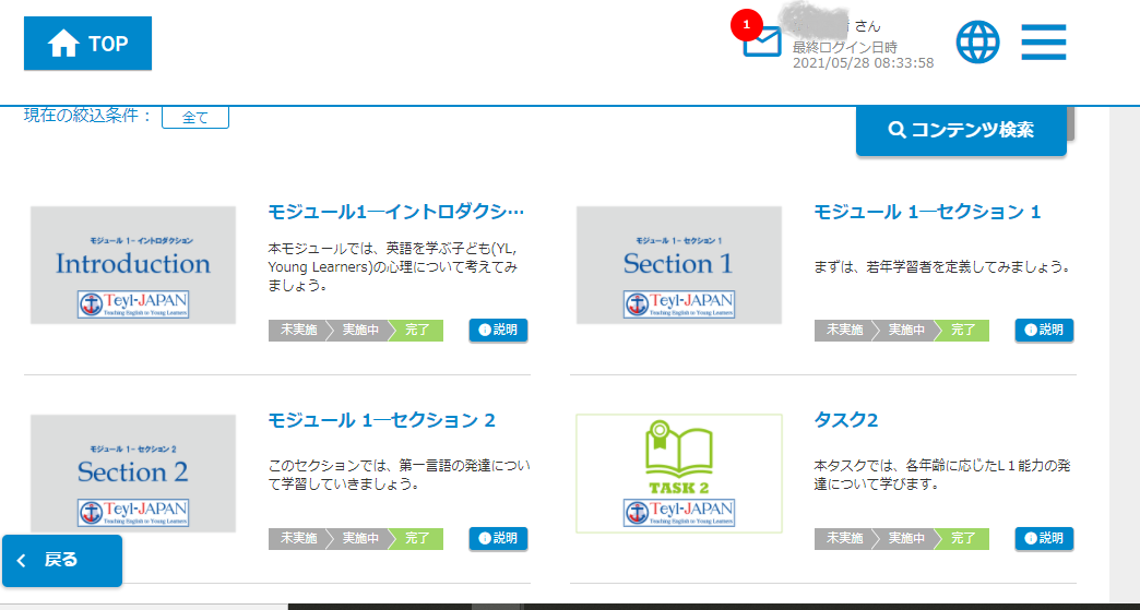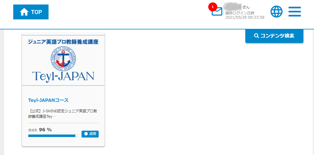 専用サイトはこんな感じになっています。トップページからTeyl-JAPANコースに入ります。現在の進度が表示されています。