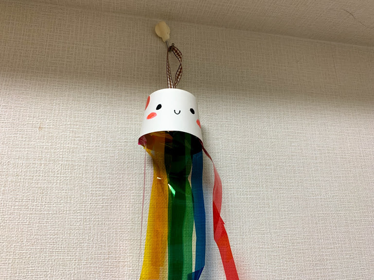海の生き物の工作は魚釣りゲームやタコなど色々なアイディアがあるのですが、今年はJellyfishにしてみました。紙コップと100均ショップで買えるカラーセロファンがあれば簡単に作ることができます。上から吊るせるようにすると風が吹くとゆらゆら揺れてくらげっぽくなりますよ!