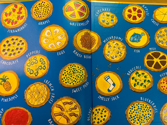こちらの絵本は裏表紙も面白いです。色々なピザがあってそれを見せると子供たちが盛り上がります。中にはSmelly socksなども。。。