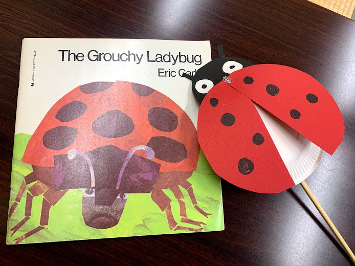 「The Grouchy ladybug」の読み聞かせのあとにはLadybugの工作がおススメ。こちらは羽が開くタイプです。