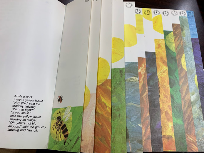 「The Grouchy ladybug」は不機嫌なてんとうむしが友達のてんとうむしとケンカして、「じぶんの強いところをみせてやる」と外の生き物たちに話しかけにいきます。ハチからはじまり、くわがた、カマキリ、はいえな・・・どんどん相手は大きくなっていき最後はクジラ!!この部分が仕掛けになっていて、生き物が大きくなるにつれ文字も画面も大きくなっていき、主人公のてんとうむしがどんどん小さく見えていくのが面白いです。