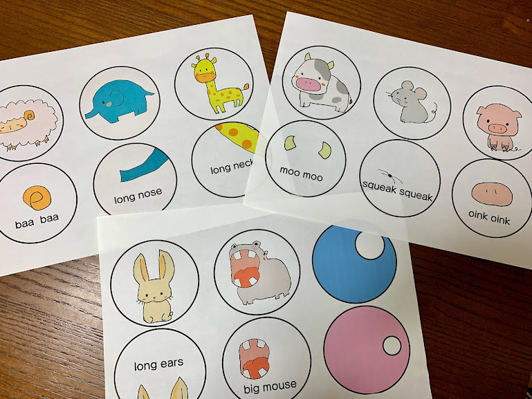9月はAnimalのテーマでレッスンを行う予定です。導入にクイズをしたいなあと思い、ペープサート教材を作ってみました。小学校低学年くらいでも使えるように形容詞”long” “big”の学習にもなるようにしてみました。形容詞バージョン4枚、鳴き声バージョン4枚に加えて、シンプルに何の動物かを当てる穴あきも加えています。