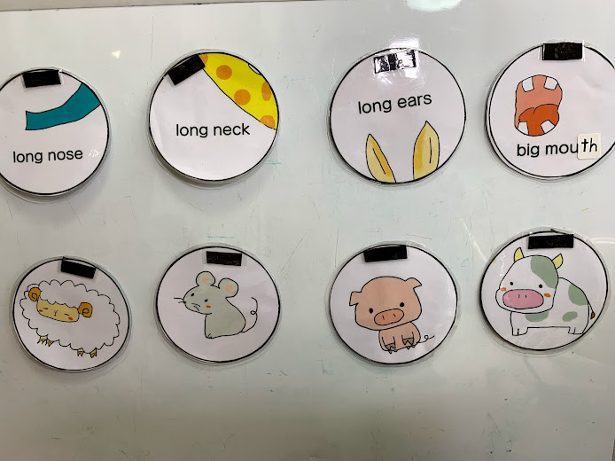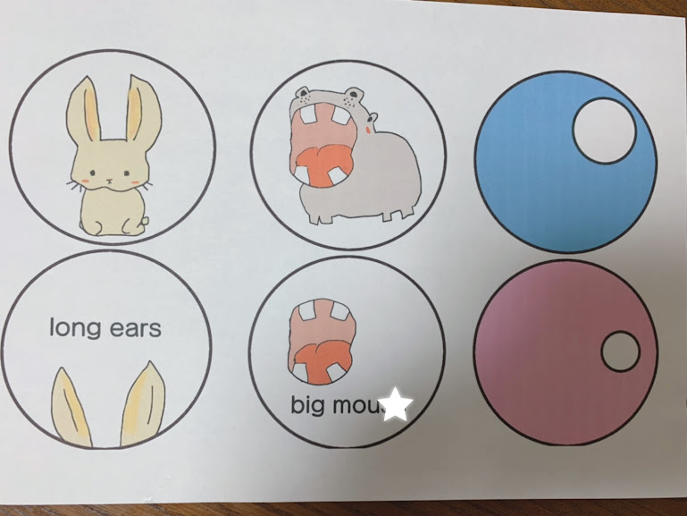 動物の特徴クイズはlong noseのelephant,long neckのgiraffe,long earsのrabbit,big mouthのhipo,の4種類です。本当は対義語のshort,littleも入れたかったのですが思いつかず。。。何か良い動物いるかなあ。。。