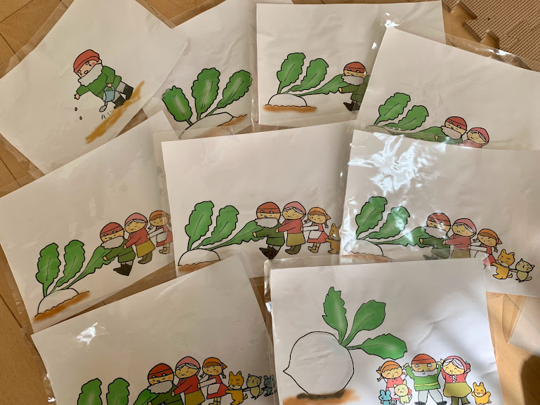 おじいさんが種をまき、大きなカブを引っ張っていくポイントだけを9枚の紙芝居のようにしました。ストーリーやセリフはクラスのレベルによって変えて見せています。